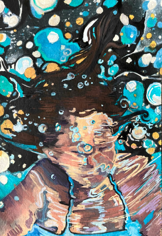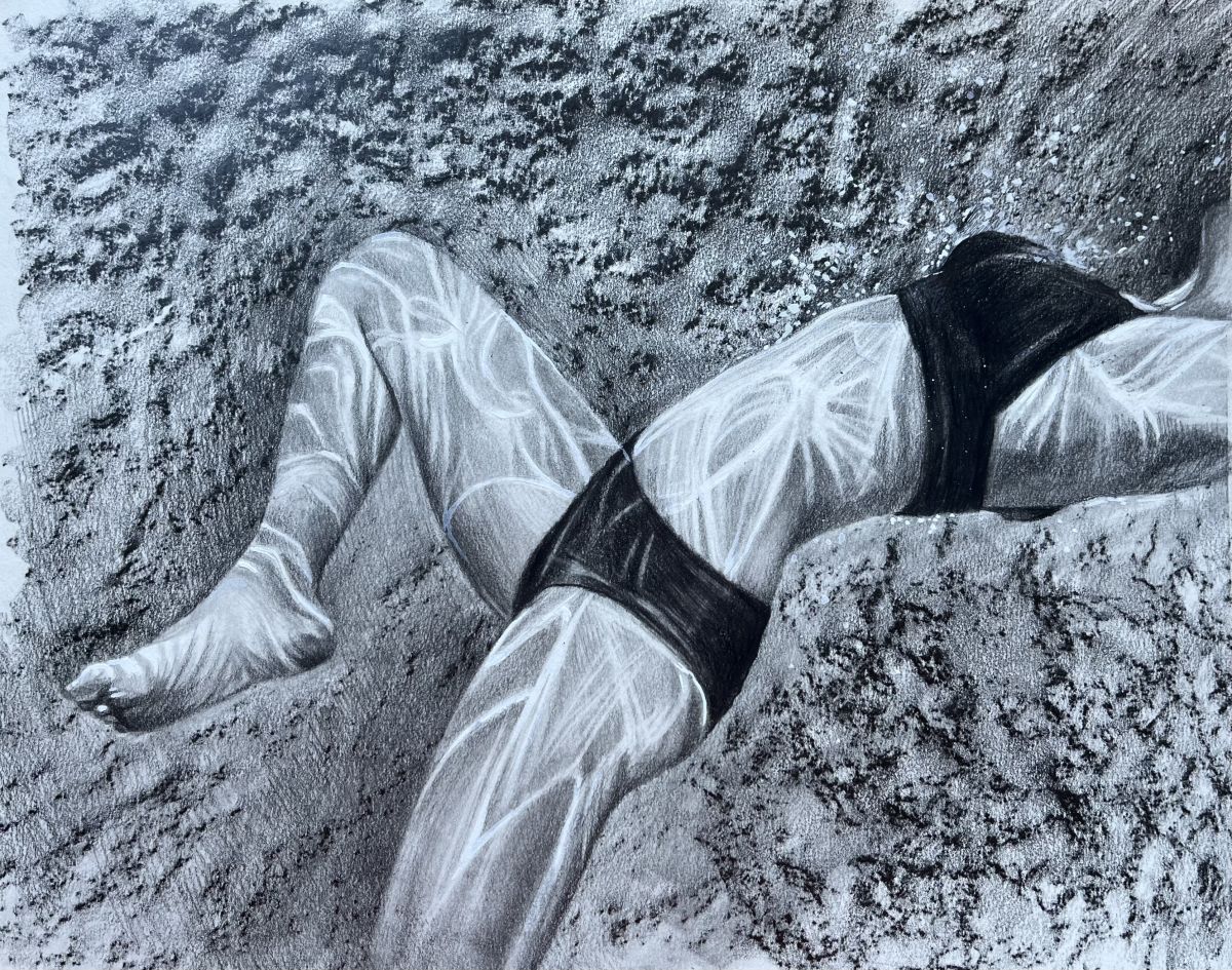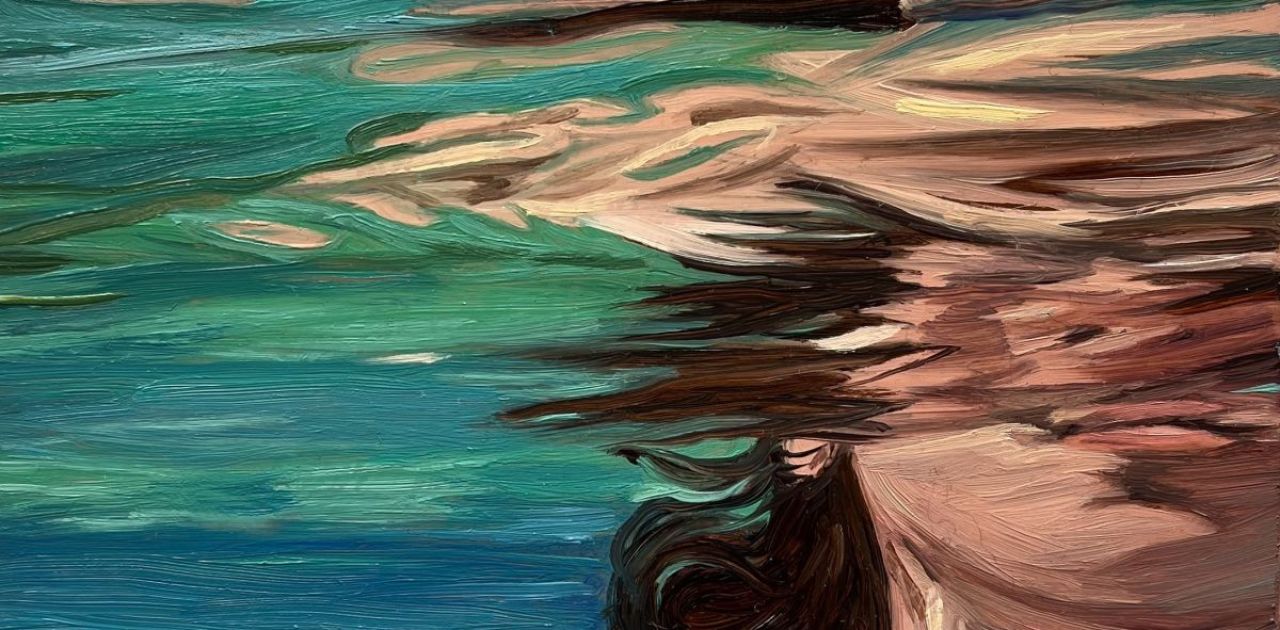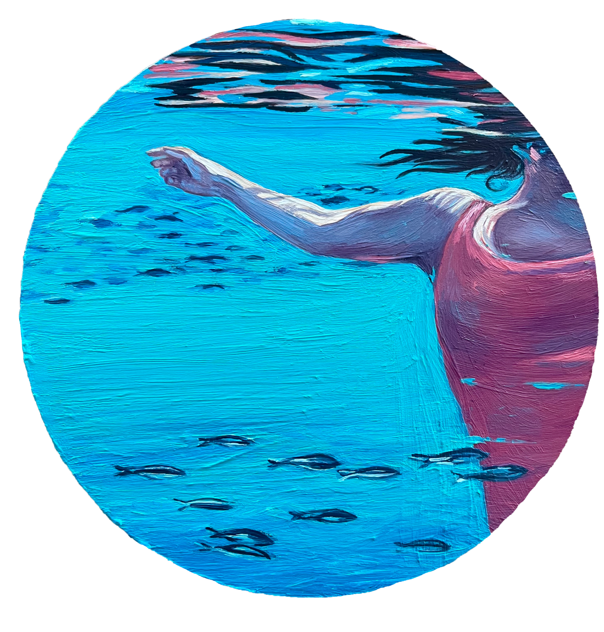 The paintings and drawings explore women’s experiences across time, weaving together personal memory and collective history. Water, especially swimming, appears as both a symbol and literal act of empowerment — a reclamation of space, a metaphor for resilience, and a meditative return to the self.