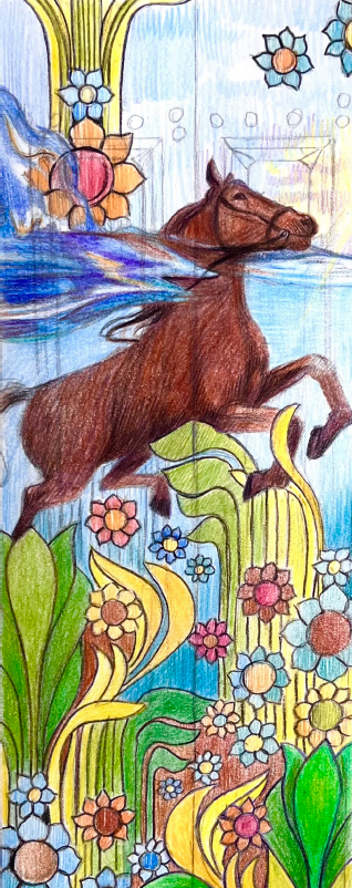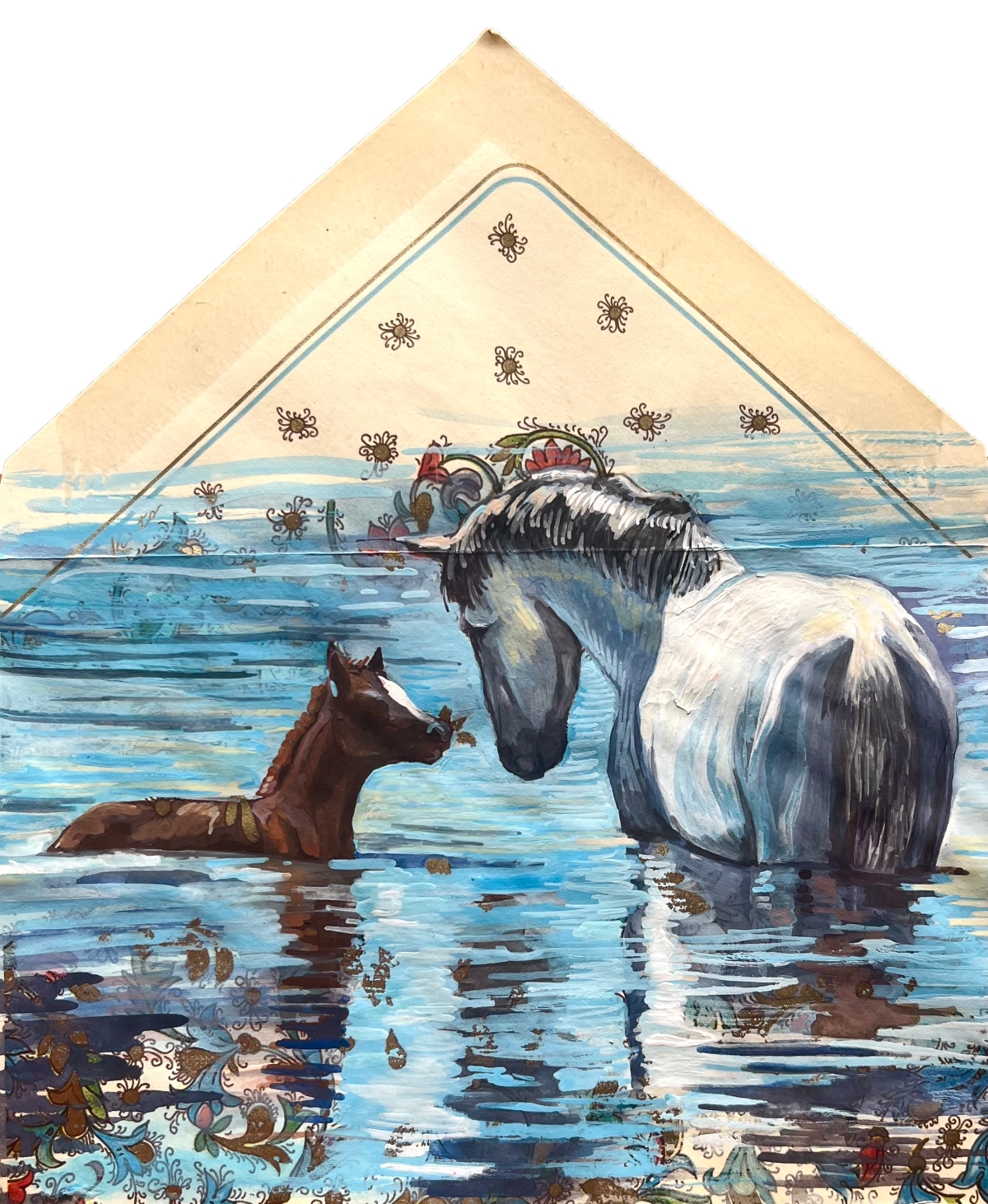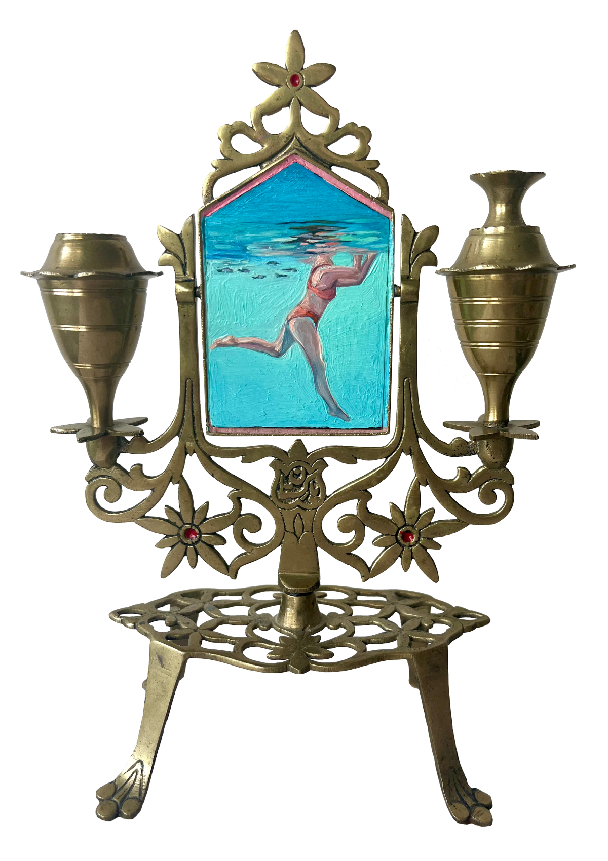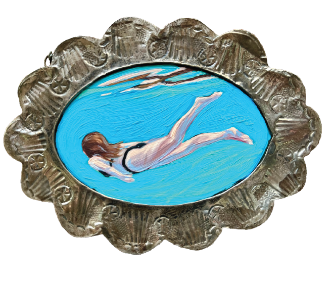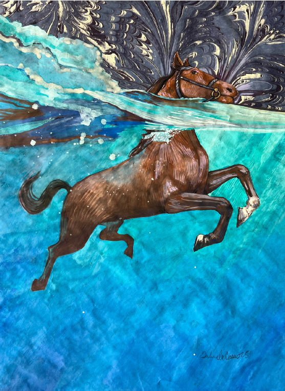 The paintings and drawings explore women’s experiences across time, weaving together personal memory and collective history. Water, especially swimming, appears as both a symbol and literal act of empowerment — a reclamation of space, a metaphor for resilience, and a meditative return to the self.