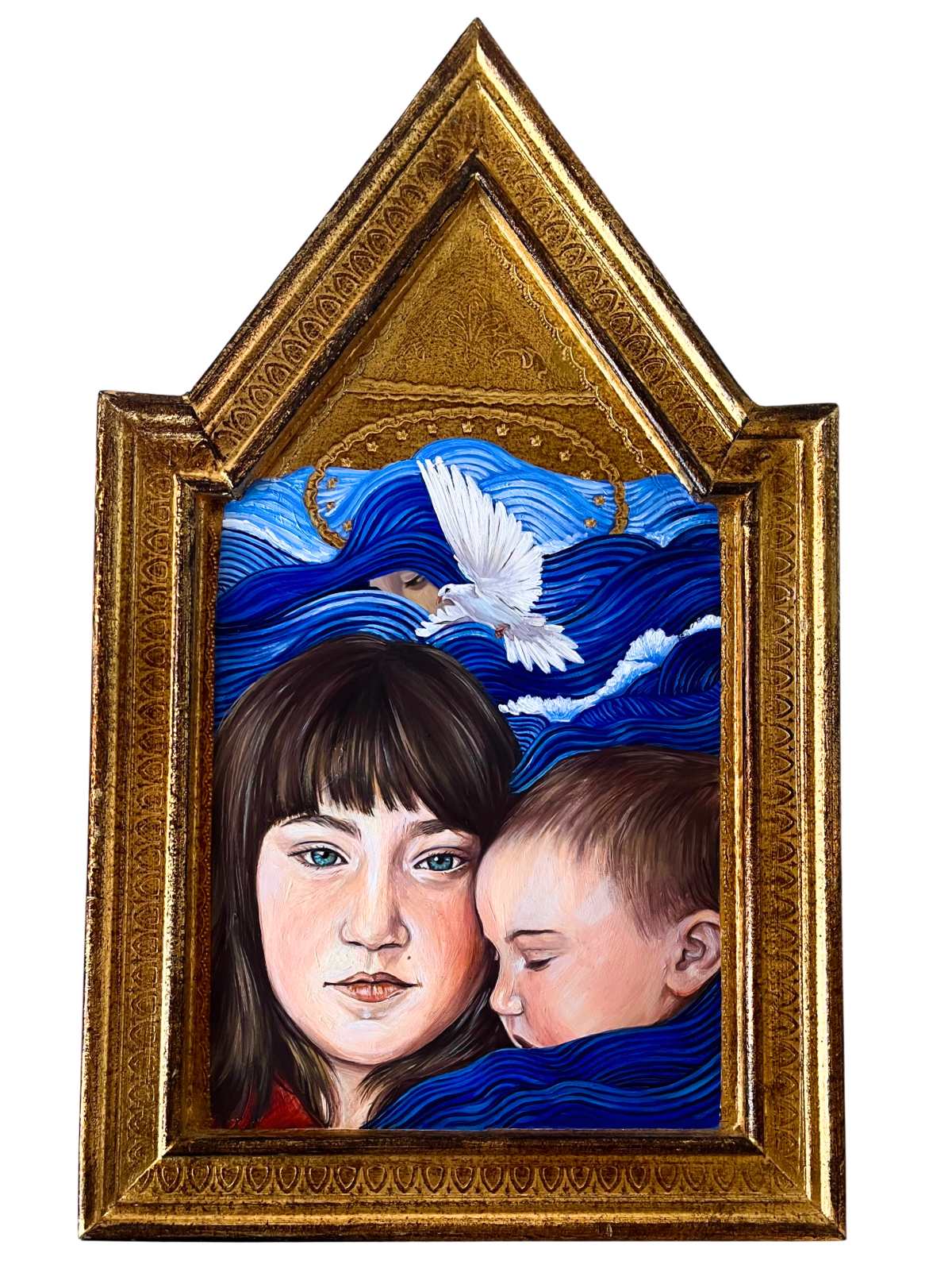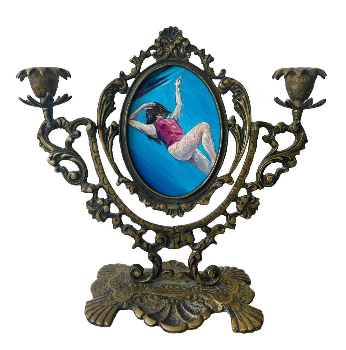 Found objects and antique frames, heavy with history, contrast with the painted figures’ weightlessness, embodying the tension between constraint and liberation.
